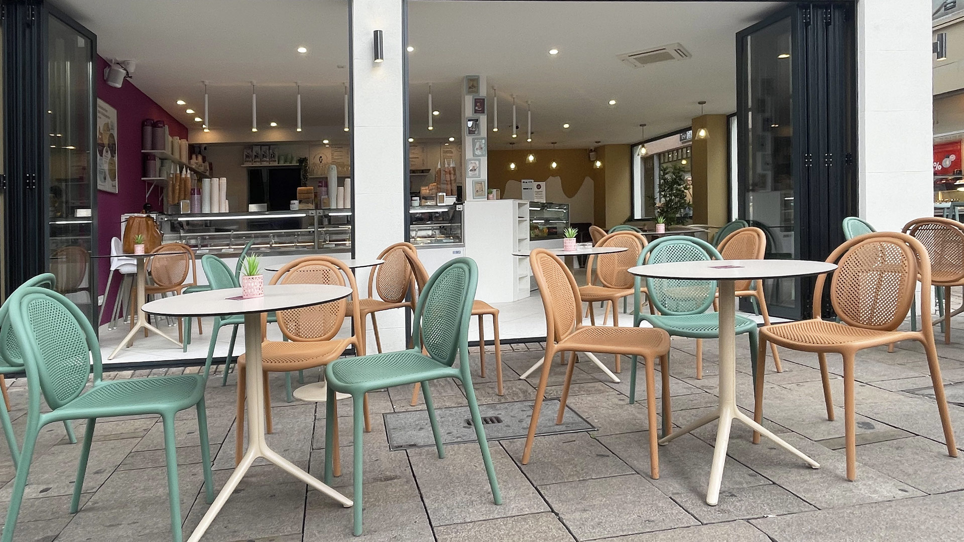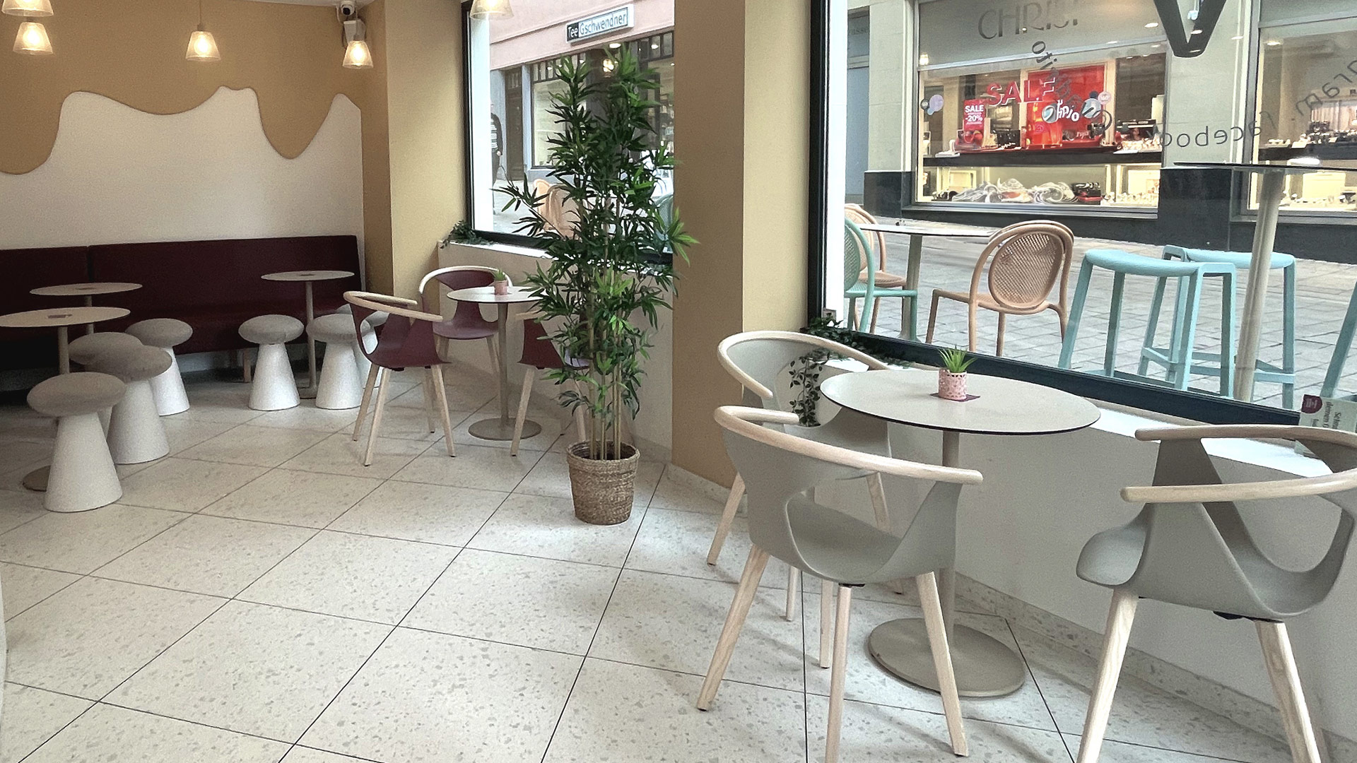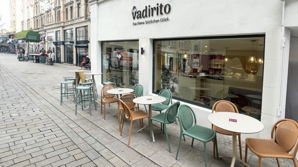 Im Frühjahr 2023 eröffnete das Eiscafé Vadirito seine Türen im Herzen der pulsierenden Innenstadt von Wiesbaden und hieß seine Gäste in einem stilvollen Ambiente willkommen, das perfekt mit seiner Corporate Identity (CI) harmoniert. Das Café bietet etwa 47 Sitzplätze, sowohl im gemütlichen Innenbereich als auch im charmanten Außenbereich, und schafft eine einladende Atmosphäre für jeden Besucher. Das Interior- Konzept des Cafés wurde sorgfältig gestaltet, um die Farben und das Design des Logos widerzuspiegeln. Violette und beige Farbtöne vereinen sich harmonisch mit hellen Fliesen und warmen Holzelementen, die eine angenehme und einladende Umgebung schaffen. Auch der Außenbereich wurde mit viel Liebe zum Detail gestaltet. Mit Outdoor-Möbeln in Beige, Terracotta und Grüntönen wurde eine erfrischende und einladende Eisoase geschaffen, die zum Verweilen und Entspannen einlädt.